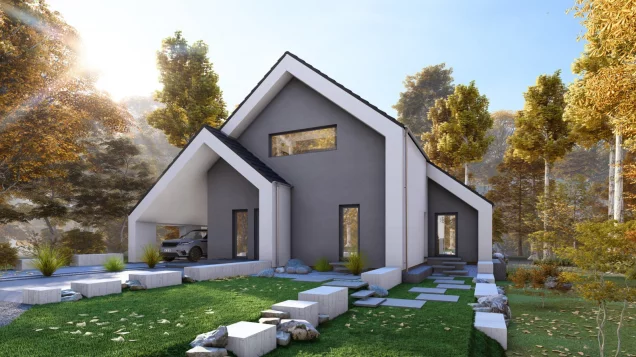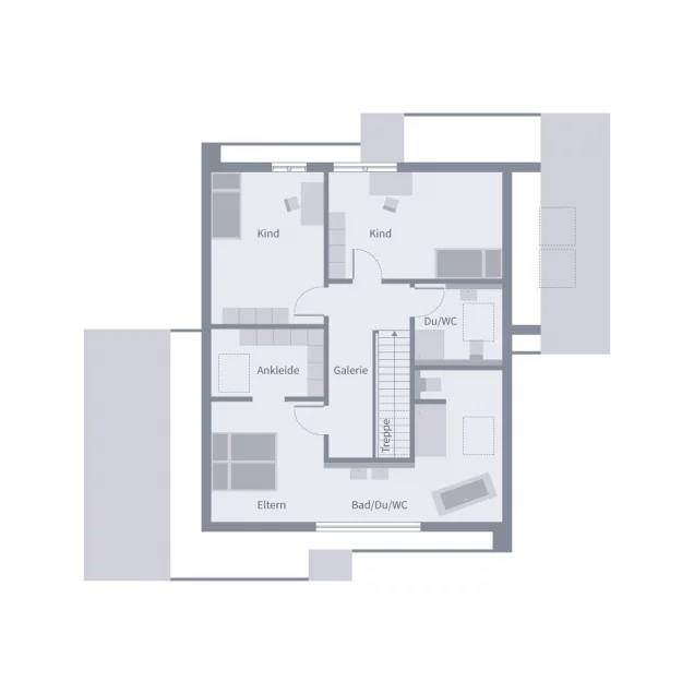 Im Erdgeschoss dieses Einfamilienhauses werden Sie von einem großzügigen und offenen Wohnzimmer empfangen, das nahtlos ins Esszimmer und anschließend in die Küche übergeht. Diese lichtdurchflutete Raumgestaltung sorgt für eine einladende Atmosphäre, die perfekt für gesellige Abende mit Familie und Freunden ist. Von hier aus gelangt man auch auf die Terrasse. Ein besonderes Highlight des Hauses ist das geräumige Carport, das nicht nur genügend Platz für Fahrzeuge bietet, sondern auch zusätzlichen Stauraum ermöglicht. Im Dachgeschoss befinden sich zwei helle Kinderzimmer, während ein gemeinsames Badezimmer zusätzlichen Komfort für die kleinen Bewohner bietet. Das große Schlafzimmer der Eltern ist ein Rückzugsort der besonderen Art, da es über ein integriertes Badezimmer und eine angrenzende Ankleide verfügt. Unser Design 13.2 kombiniert durchdachte Raumkonzepte mit modernen Designelementen und schafft so ein stilvolles sowie praktisches Zuhause.