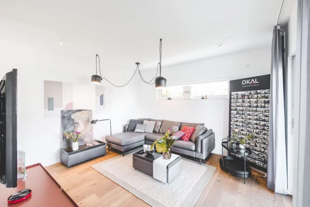 Wer sich dem Purismus verschrieben hat, wird dem Kubus mit Flachdach kaum widerstehen können. Als Hommage an die Bauhausära vereint die Stadtvilla schnörkellose Ästhetik mit kompromissloser Funktionalität. Die reduzierte Architektur wird durch den Versatz und die Signalkraft der bauhaustypischen Farben bewusst unterbrochen. Die klare Formgebung findet sich auch im Innenbereich wieder. Der große Wohn-, Koch- und Essbereich ist offen und hell, nur ein Wandelement dient der optischen Unterteilung. Im Obergeschoss befindet sich der äußerst großzügige Elternbereich. Doch auch für Kinder, Büro und Gäste ist reichlich Platz im Black Label 13.