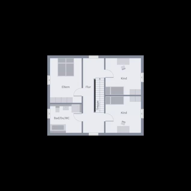 Im Obergeschoss empfängt Sie ein lichtdurchfluteter Flur, der zu den privaten Rückzugsorten führt. Ein großzügiges Elternzimmer, zwei Kinderzimmer sowie ein komfortables Familienbad schaffen Raum für Erholung, Wachstum und gemeinsames Leben. Unter dem klassischen Satteldach entsteht so ein Zuhause, das Ästhetik, Geborgenheit und Zukunftsperspektive vereint.