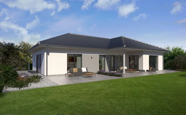 Eine Ebene, zwei Wohneinheiten, maximaler Wohnkomfort, keine Abstriche - unser Bungalow 4 erfüllt auf einer Grundfläche von knapp 170 Quadratmetern all diese Kriterien. Die Hauptwohnung bietet Raum für die kleine Familie. Von der großen Diele führt der Weg direkt in den großen Wohn-Ess-Kochbereich, der durch seinen außergewöhnlichen Grundriss besticht. Dank eines baulichen Vorsprungs ist hier eine geräumige, lichtdurchflutete Nische entstanden, in der ein großer Esstisch Platz findet. Und auch für eine Küche mit Kochinsel und für eine gemütliche Couchecke ist ausreichend Raum. Von hier geht es auch direkt auf die gemütliche Terrasse. Ebenfalls in der Hauptwohnung: das Elternschlafzimmer, ein Kinderzimmer, Hauswirtschaftsraum, Badezimmer sowie Gäste-WC. Die danebenliegende Einliegerwohnung bietet mit einem Wohn-Ess-Koch-Bereich, Schlafzimmer, Bad und Hauswirtschaftsraum Platz für Singles, Paare oder die Großeltern - kann aber auch als separates Büro genutzt werden.