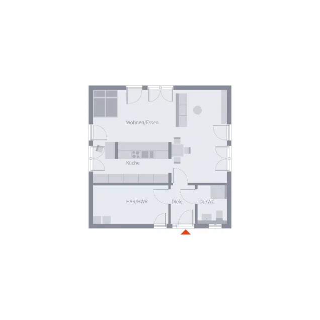 Der Tiny Single Bungalow 3 zeigt, dass komfortables Wohnen auf kleinem Raum durchaus realisierbar ist. Dieses durchdachte Wohnkonzept richtet sich speziell an Singles und Paare, die sich auf das Wesentliche konzentrieren möchten, ohne dabei auf hohen Komfort verzichten zu müssen. Ein besonderes Highlight des Bungalows mit einer Wohnfläche von nur 73 m² ist der offene, lichtdurchflutete Wohn-Ess-Bereich, der nahtlos mit der angrenzenden Küche verbunden ist. Die offene Gestaltung und die fließenden Übergänge schaffen ein angenehmes Raumgefühl. Das kompakte Bad mit Dusche und WC fügt sich harmonisch in das Gesamtkonzept ein, während der Hauswirtschaftsraum ausreichend Platz für moderne Technik bietet - für ein zeitgemäßes Wohnen mit MEHR an Komfort. Bodentiefe Fenster sorgen nicht nur für reichlich Licht im Wohn-Ess-Bereich, sondern ermöglichen auch den direkten Zugang zur Terrasse.