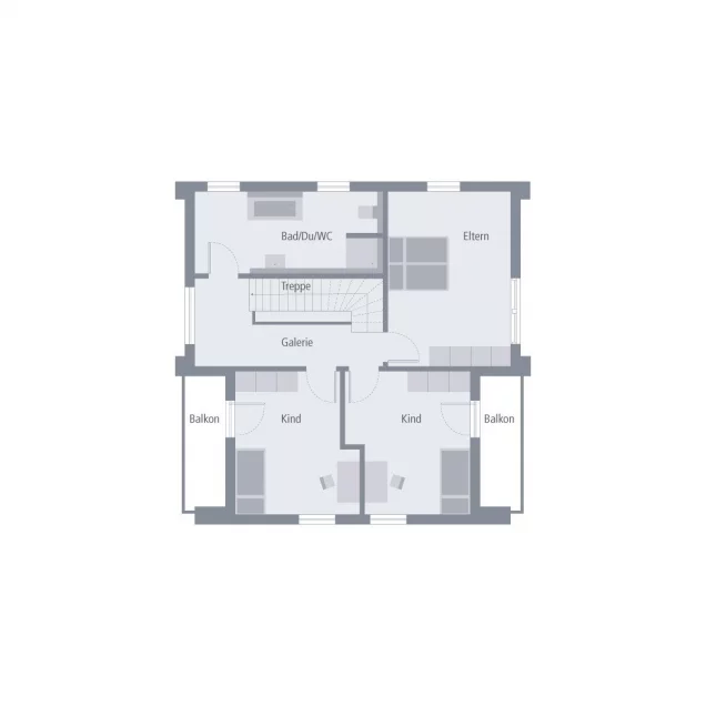 Mehr als nur Standard: Mit unserem Designhaus 17.2 erfüllen wir den Wunsch nach modernen, außergewöhnlichen Architekturkonzepten, in denen Komfort und Gemütlichkeit dennoch nicht zu kurz kommen. Dies erreichen wir durch durchdachte Raumlösungen wie dem ausgefallenen Ess- und Küchenbereich, bei dem sich die Küchenzeile entlang der gesamten Wandbreite zieht. An diesen offenen Gemeinschaftsbereich schließt sich das moderne Wohnzimmer an, das zum Verweilen einlädt. Ein Gäste-WC sowie der Hauswirtschaftsraum komplettieren das Raumkonzept des Erdgeschosses. Das Obergeschoss beherbergt beim Einfamilienhaus Design 17.2 wiederum die privaten Rückzugsmöglichkeiten für die ganze Familie. Hier findet sich neben zwei großen und hellen Kinderzimmern, die beide über einen kleinen Balkon verfügen, auch der Schlafbereich der Eltern, der viel Platz für Bett, Schränke und Co. bietet. Ein großes Bad mit Dusche und Badewanne rundet das Design der Etage gekonnt ab und ist über die offene Galerie zu erreichen.