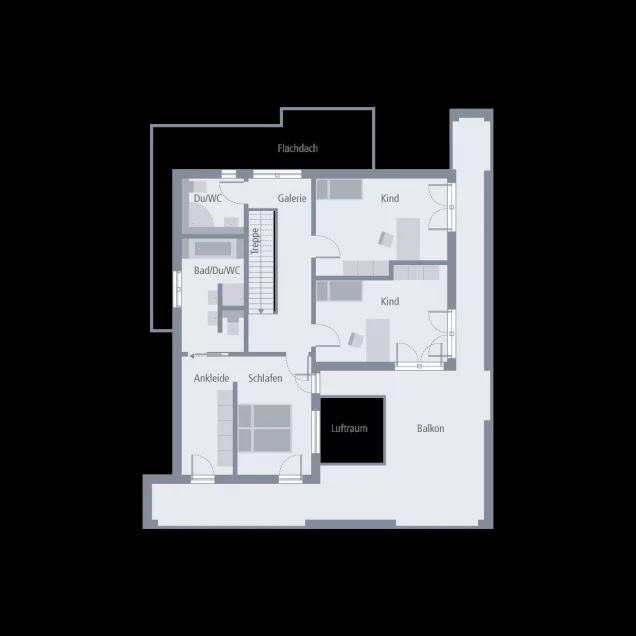 Im hellen Wohnraum, der zugleich das Herzstück des Erdgeschosses ist, führt eine Treppe ins Obergeschoss. Dank des Flachdaches kann dieses ohne Einschränkungen im Hinblick auf die Stockhöhe genutzt werden. Doch das ist nur einer der zahlreichen Vorteile, die in der ersten Etage des Musterhaus Wuppertal zum Tragen kommen. Auf dieser Ebene befinden sich drei Schlafräume - zwei Kinderzimmer und ein Elternzimmer mit sich anschließendem Ankleideraum - ein großes Bad sowie eine separate Toilette. Hier befindet sich aber vor allem das ohne Frage absolute Highlight des Musterhaus Wuppertal: Hier dominiert die über Eck laufende, 58 qm große Dachterrasse, die von allen drei Schlafzimmern direkt zugänglich ist.