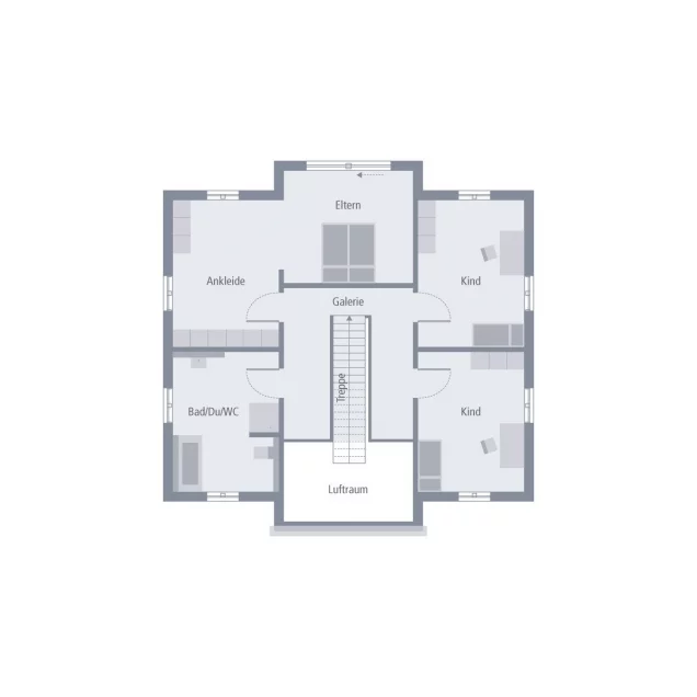 Aha-Effekte außen, Aha-Effekte innen. Das Haus Design 22 besticht nicht nur durch seine außergewöhnliche Optik, sondern in gleichem Maße durch seine bis ins kleinste Detail durchdachte Architektur. Das beginnt bereits bei der Fassadengestaltung: Der moderne Erker auf der Rückseite des Hauses ist nicht nur ein echter Hingucker, die großen, bodentiefen Fenster sorgen zudem im Inneren für lichtdurchflutete Räume und ein besonderes Gefühl von Größe. Innen- und Außenbereich verschmelzen optisch miteinander. Der Wohnbereich im Erdgeschoss besticht durch die Größe und Offenheit. Neben dem Wohn-Ess-Kochbereich und der offenen Diele gibt es hier Garderobe, Hauswirtschaftsraum, Gäste-WC sowie ein Arbeitszimmer. Ein weiteres Highlight auf rund 180 m² Wohnfläche ist die zentral gelegene Treppe und die dadurch im Obergeschoss entstehende Galerie. Hier oben finden zudem die Eltern in einem Schlaf- und einem Ankleidebereich, sowie bis zu zwei Kinder, Platz. Ein großes Bad rundet das Raumangebot im Obergeschoss ab.