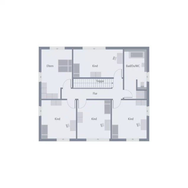 Das Design 19.1 ist der Traum jeder Großfamilie. Vier Kinderzimmer stehen im Obergeschoss zur Verfügung und bieten viele Möglichkeiten der Gestaltung. So können hier beispielsweise vier Schlafzimmer, aber auch eine Variante aus Schlaf- und Spielzimmer entstehen. Das Elternschlafzimmer sowie ein geräumiges Bad mit Badewanne und Dusche runden das Raumangebot in dieser Etage ab. Viele Räume, aber keine beengten Verhältnisse, denn alle Familienmitglieder haben dank der cleveren Raumaufteilung rund 16 m² Platz zum Leben, Schlafen und Entspannen. Komfortabel gestaltet sich auch das Erdgeschoss, das durch seine besondere Aufteilung besticht. In den Wohn-Ess-Bereich integriert und doch räumlich abgetrennt liegt die Küche als Mittelpunkt dieser Ebene. Das verleiht den Räumen ein ganz besonderes Flair - offen und doch gemütlich. Ein weiteres großes Zimmer, das beispielsweise für Gäste oder als Büro genutzt werden kann, ein Hauswirtschaftsraum sowie ein Gäste-WC befinden sich ebenfalls im Erdgeschoss.
