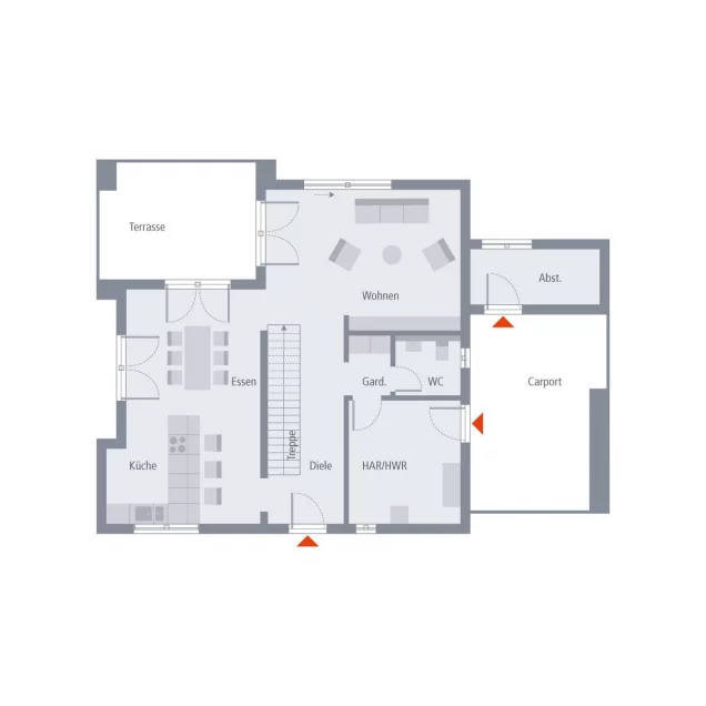Eines der zahlreichen Highlights unseres Black Label 22 ist der integrierte Carport, der es den künftigen Eigenheimbesitzern nicht nur ermöglicht, das Haus trockenen Fußes zu betreten. Zudem befindet sich unmittelbar darüber eine große Dachterrasse, die schnell zum idealen Lieblingsplatz avancieren kann. Doch auch im Inneren kann das rund 256 m² große Haus, das aus rechteckigen Elementen unterschiedlicher Größe besteht, mit zahlreichen Vorteilen überzeugen. Im Erdgeschoss nimmt das Wohn-Ess-Zimmer mit integrierter Küche fast den kompletten Raum ein und besticht durch seine offene Gestaltung. Ebenfalls Parterre: Ein Hauswirtschaftsraum sowie Gäste-WC und der große Carport, an den sich unmittelbar ein Abstellraum anschließt. Im Obergeschoss gehört die rechte Haushälfte den kleinen Hausbewohnern. Hier befinden sich drei Kinderzimmer, die alle über einen Zugang zur großen Dachterrasse verfügen. Glasgeländer ermöglichen einen ungetrübten Blick in den Garten. Die linke Haushälfte bildet unterdessen das Reich der Eltern. Diesen steht ein großer Schlafbereich mit Ankleidezimmer und Bad sowie ein eigener Balkon zur Verfügung.