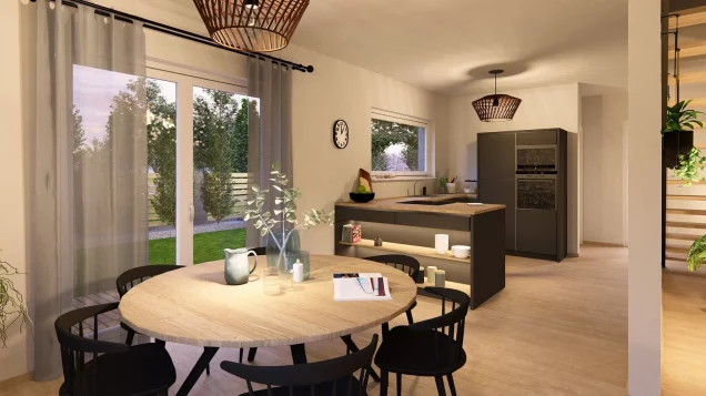 Zeitlose Eleganz außen, Weite und ein besonderes Raumgefühl innen - das ist unser Design 10. Unter dem Satteldach warten hier rund 135 m² auf zwei Ebenen darauf, bezogen und mit Leben gefüllt zu werden. Im Erdgeschoss ist Offenheit Trumpf: Hier erstreckt sich der große Wohn-Ess-Koch-Bereich nahezu über die gesamte Ebene, wird nur durch die zentral platzierte Treppe von der Diele abgetrennt. Das Ergebnis: ein lichtdurchfluteter, einladender und großzügiger Bereich zum Wohlfühlen und Treffen. Im Eingangsbereich stehen zudem ein kleines Gäste-WC sowie ein großer Hauswirtschaftsraum zur Verfügung. Über die mittig gelegene Treppe geht es ins Obergeschoss. Hier ist ausreichend Raum für Eltern und bis zu zwei Kinder. Die Eltern verfügen über ein großzügig geschnittenes Reich mit separatem Ankleideraum, zwei große Kinderzimmer lassen ebenfalls keine Wünsche offen. Abgerundet wird das Raumangebot in der oberen Etage durch ein großes Badezimmer mit Dusche, Wanne und WC.