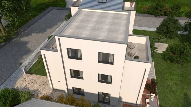Die zweite Wohneinheit bietet rund 170 m2 luxuriösen Wohnraum und erstreckt sich über die mittlere Etage mit großer Essküche, Bad und den Schlafzimmern sowie das offen gestaltete Dachgeschoss zum Wohnen und Arbeiten. Es bleibt sogar noch ausreichend Raum für Hobbys und Co. Der moderne Ateliercharakter und die Dachterrassen verleihen der oberen Etage einen ultimativen Lieblingsplatz-Status.