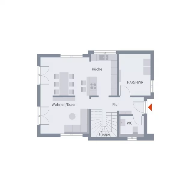 Schlichte Eleganz und ein durchdachtes Raumkonzept verleihen diesem Einfamilienhaus seine besondere Ausstrahlung. Die klare Linienführung der Architektur wird von einer zweifarbigen Fassadengestaltung betont, die Tiefe und Charakter schenkt. Im Inneren setzt sich diese Klarheit fort: Das Erdgeschoss öffnet sich zu einem lichtdurchfluteten Wohn-, Ess- und Kochbereich, der fließend in den Garten übergeht - ein Ort für lebendige Begegnungen und stille Augenblicke. Hauswirtschaftsraum und Gäste-WC sind dezent abgetrennt und sorgen für praktische Funktionalität. Von der großzügigen Diele führt eine Treppe ins Dachgeschoss, wo der Raum optimal genutzt ist: Ein helles Kinderzimmer, ein Elternschlafzimmer, ein Büro und ein komfortables Bad mit Wanne, Dusche und WC schaffen ein harmonisches Wohnumfeld. Auf rund 130 m² entsteht so ein Zuhause, das beständig Freude schenkt und Generationen verbindet.