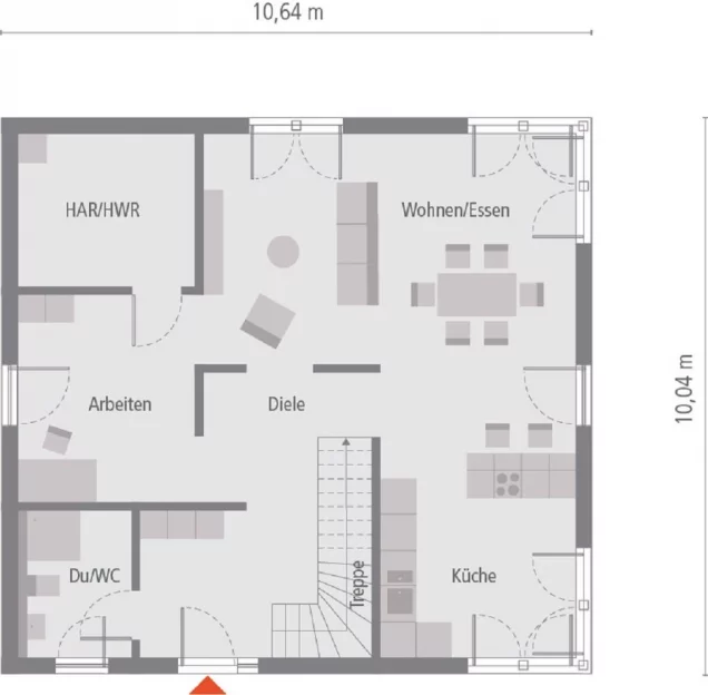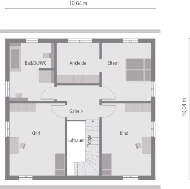 Mehr als nur Standard: Mit unserem Designhaus 17.2 erfüllen wir den Wunsch nach modernen, außergewöhnlichen Architekturkonzepten, in denen Komfort und Gemütlichkeit dennoch nicht zu kurz kommen. Dies erreichen wir durch durchdachte Raumlösungen wie dem ausgefallenen Ess- und Küchenbereich, bei dem sich die Küchenzeile entlang der gesamten Wandbreite zieht. An diesen offenen Gemeinschaftsbereich schließt sich das moderne Wohnzimmer an, das zum Verweilen einlädt. Ein Gäste-WC sowie der Hauswirtschaftsraum komplettieren das Raumkonzept des Erdgeschosses. Das Obergeschoss beherbergt beim Einfamilienhaus Design 17.2 wiederum die privaten Rückzugsmöglichkeiten für die ganze Familie. Hier findet sich neben zwei großen und hellen Kinderzimmern, die beide über einen kleinen Balkon verfügen, auch der Schlafbereich der Eltern, der viel Platz für Bett, Schränke und Co. bietet. Ein großes Bad mit Dusche und Badewanne rundet das Design der Etage gekonnt ab und ist über die offene Galerie zu erreichen.
