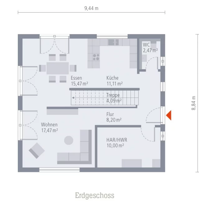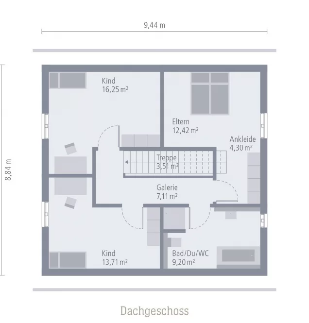 Zeitlose Eleganz außen, Weite und ein besonderes Raumgefühl innen - das ist unser Design 10. Unter dem Satteldach warten hier rund 135 m² auf zwei Ebenen darauf, bezogen und mit Leben gefüllt zu werden. Im Erdgeschoss ist Offenheit Trumpf: Hier erstreckt sich der große Wohn-Ess-Koch-Bereich nahezu über die gesamte Ebene, wird nur durch die zentral platzierte Treppe von der Diele abgetrennt. Das Ergebnis: ein lichtdurchfluteter, einladender und großzügiger Bereich zum Wohlfühlen und Treffen. Im Eingangsbereich stehen zudem ein kleines Gäste-WC sowie ein großer Hauswirtschaftsraum zur Verfügung. Über die mittig gelegene Treppe geht es ins Obergeschoss. Hier ist ausreichend Raum für Eltern und bis zu zwei Kinder. Die Eltern verfügen über ein großzügig geschnittenes Reich mit separatem Ankleideraum, zwei große Kinderzimmer lassen ebenfalls keine Wünsche offen. Abgerundet wird das Raumangebot in der oberen Etage durch ein großes Badezimmer mit Dusche, Wanne und WC.