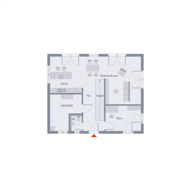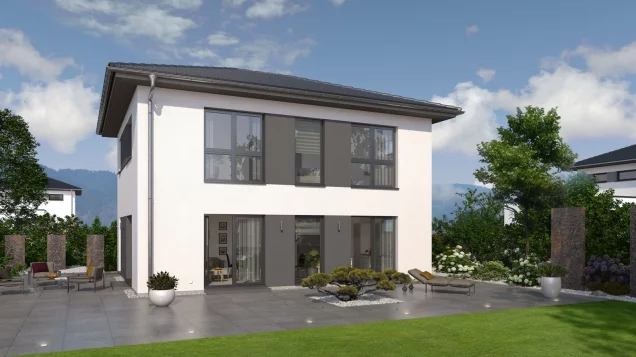 Ein Walmdach, das verkörpert Eleganz und vermittelt einen edlen, fast schon herrschaftlichen Eindruck. So auch bei unserer Stadtvilla 10 mit Walmdach. Das große Plus: Dank dieser Dachform gibt es im Obergeschoss keine Dachschrägen und damit zahlreiche Möglichkeiten zum Positionieren der Möbel. Doch diese Stadtvilla kann noch mit vielen weiteren kleinen und großen Ausstattungs- und Grundrissdetails punkten. So gibt es im ca. 78 m² großen Erdgeschoss eine räumliche Zweiteilung: die Zimmer zum Entspannen und Zusammenkommen auf der Gartenseite, die funktionellen Räume auf der, der Straße zugewandten, Seite. Konkret bedeutet das: vom großen Wohn-Ess-Koch-Bereich ist der direkte Zugang auf die Terrasse und damit ins Grüne möglich. Büro, Hauswirtschaftsraum sowie Gäste-WC sind unterdessen gegenüberliegend und unmittelbar aus der Diele zugänglich. Im Obergeschoss befinden sich neben dem Reich der Eltern zwei identisch große Kinderzimmer sowie ein geräumiges Bad mit Wanne, Dusche und WC.