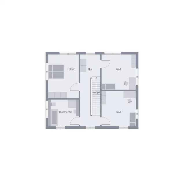 Ein Walmdach, das verkörpert Eleganz und vermittelt einen edlen, fast schon herrschaftlichen Eindruck. So auch bei unserer Stadtvilla 10 mit Walmdach. Das große Plus: Dank dieser Dachform gibt es im Obergeschoss keine Dachschrägen und damit zahlreiche Möglichkeiten zum Positionieren der Möbel. Doch diese Stadtvilla kann noch mit vielen weiteren kleinen und großen Ausstattungs- und Grundrissdetails punkten. So gibt es im ca. 78 m² großen Erdgeschoss eine räumliche Zweiteilung: die Zimmer zum Entspannen und Zusammenkommen auf der Gartenseite, die funktionellen Räume auf der, der Straße zugewandten, Seite. Konkret bedeutet das: vom großen Wohn-Ess-Koch-Bereich ist der direkte Zugang auf die Terrasse und damit ins Grüne möglich. Büro, Hauswirtschaftsraum sowie Gäste-WC sind unterdessen gegenüberliegend und unmittelbar aus der Diele zugänglich. Im Obergeschoss befinden sich neben dem Reich der Eltern zwei identisch große Kinderzimmer sowie ein geräumiges Bad mit Wanne, Dusche und WC.