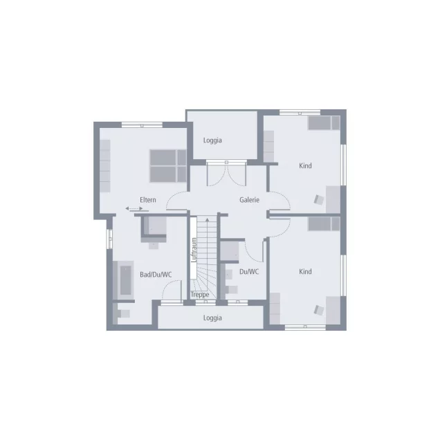 Eine Treppe führt nach oben in eine zentrale Galerie.