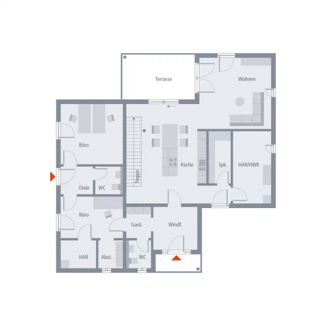 Leben und Arbeiten unter einem Dach - das ist in unserem Staffel 16 auf besondere Weise möglich. Denn hier vereinen sich die Wohlfühlatmosphäre der Wohnräume und die durchdachte Aufteilung des sich im vorderen Bereich des Hauses befindlichen Bürokomplexes zu einer harmonischen Symbiose. Die beiden Büroräume mit Gäste-WC, Abstellraum und sich unmittelbar anschließendem Hauswirtschaftsraum befinden sich im eingeschossigen Anbau, der nicht nur für einen Mehrwert im Hinblick auf die Nutzung sorgt. Denn der farblich abgesetzte Anbau wertet auch die Fassade auf und sorgt für einen echten Hingucker. Insgesamt stehen den künftigen Eigenheimbesitzern mehr als 218 m² Wohnfläche, verteilt auf zwei Ebenen zur Verfügung. Neben den beiden Büros befindet sich Parterre der große und helle Wohn-Ess-Koch-Bereich mit angegliederter Speisekammer und einem weiteren Hauswirtschaftsraum sowie ein zweites Gäste-WC und eine Garderobe. Über die zentral im Esszimmer gelegene Treppe führt der Weg ins Obergeschoss. Dort befinden sich das Elternschlafzimmer mit Ankleideraum und Badezimmer sowie zwei weitere Schlafzimmer, die über ein separates Bad verfügen.