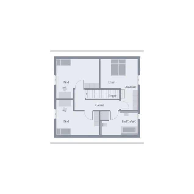 Zeitlose Eleganz außen, Weite und ein besonderes Raumgefühl innen - das ist unser Design 10. Unter dem Satteldach warten hier rund 135 m² auf zwei Ebenen darauf, bezogen und mit Leben gefüllt zu werden. Im Erdgeschoss ist Offenheit Trumpf: Hier erstreckt sich der große Wohn-Ess-Koch-Bereich nahezu über die gesamte Ebene, wird nur durch die zentral platzierte Treppe von der Diele abgetrennt. Das Ergebnis: ein lichtdurchfluteter, einladender und großzügiger Bereich zum Wohlfühlen und Treffen. Im Eingangsbereich stehen zudem ein kleines Gäste-WC sowie ein großer Hauswirtschaftsraum zur Verfügung. Über die mittig gelegene Treppe geht es ins Obergeschoss. Hier ist ausreichend Raum für Eltern und bis zu zwei Kinder. Die Eltern verfügen über ein großzügig geschnittenes Reich mit separatem Ankleideraum, zwei große Kinderzimmer lassen ebenfalls keine Wünsche offen. Abgerundet wird das Raumangebot in der oberen Etage durch ein großes Badezimmer mit Dusche, Wanne und WC.