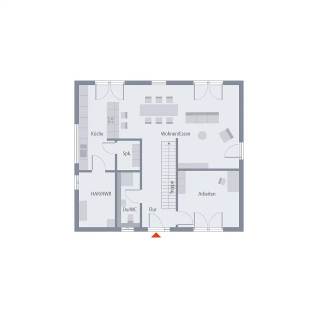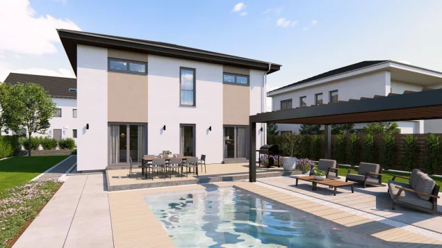 Groß, zeitlos-elegant und bis ins kleinste Detail durchdacht - das ist unsere Stadtvilla 16. Auf einer Fläche von mehr als 180 m2, verteilt auf zwei Ebenen, ist ausreichend Platz zum Leben, Arbeiten und Relaxen. Zentraler Ort der Begegnung für Familie und Freunde ist der rund 50 m² große Wohn-Ess-Koch-Bereich. Große Fensterfronten ermöglichen einen direkten Zugang zum Garten und sorgen für maximalen Lichteinfall. Besonders praktisch: Direkt an die Küche schließen sich eine Speisekammer sowie der große Hauswirtschaftsraum an. Außerdem im Erdgeschoss: komfortables Arbeitszimmer und Gäste-WC. Über den offenen Dielenbereich geht es ins Obergeschoss und damit in den Rückzugsort für die Familienmitglieder. Die Eltern verfügen hier über eine Wohlfühloase mit großem Schlafbereich, separatem Ankleidezimmer und sich unmittelbar anschließendem Badezimmer mit Wanne, Dusche und WC. Gegenüber: das Reich der Kinder. Die beiden geräumigen Zimmer werden durch ein eigenes Bad voneinander getrennt. Abgerundet wird das Raumangebot durch einen praktischen Abstellraum.