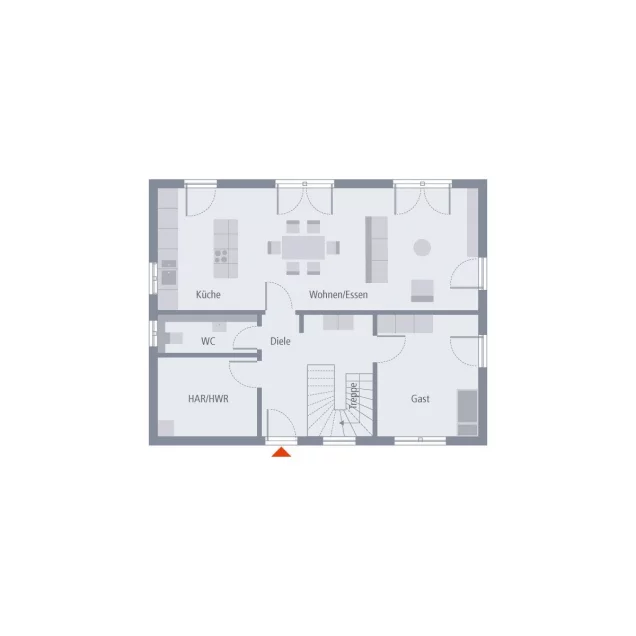 Ein echter Blickfang des Design 12 ist die Fassade, die durch ihre farbige Gestaltung zum echten Hingucker wird. Doch auch die Räume unter dem Satteldach haben auf mehr als 160 m² Wohnfläche vieles zu bieten: Von der Diele haben Sie Zugang in die Küche mit angeschlossenem Wohn-Ess-Bereich. Im Erdgeschoss führen fünf Türen nach draußen und sorgen zugleich für viel Licht. Ebenfalls auf dieser Etage: WC, Hauswirtschaftsraum sowie ein weiterer Raum, der als Gästezimmer oder Büro genutzt werden kann. Von der Diele führt auch eine Treppe ins Dachgeschoss. Hier steht den Eltern ein großes Reich mit direkt angeschlossenem Ankleidezimmer zur Verfügung, und auch für zwei Kinder ist viel Platz zum Toben, Schlafen, Spielen oder Lernen. Ein echtes Highlight: das knapp 16 m² große Badezimmer.