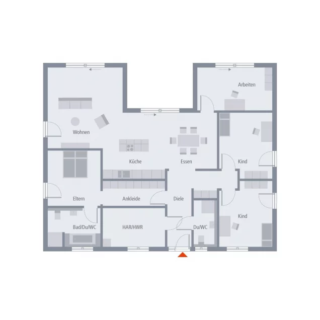 Ein bis ins kleinste Detail durchdachtes Raumwunder ist der Bungalow 3 mit seiner Wohnfläche von knapp 150 m2. Hier finden Familien mit bis zu zwei Kindern Platz und haben zudem noch die Möglichkeit, sich ein eigenes Büro oder alternativ einen Hobbyraum einzurichten. Durch die symmetrische Grundrissgestaltung mit einem Rückversatz entsteht im Außenbereich ein vor Blicken geschützter Bereich, der sich perfekt als Terrasse und damit als Rückzugsort eignet. Der Zugang ist möglich durch den großen und hellen Wohn-Essbereich mit integrierter Küche. Diese ist so konzipiert, dass das Einbinden einer Kochinsel problemlos möglich ist und als idealer Raumteiler zwischen Wohn- und Essbereich fungieren kann. Das Arbeitszimmer ist von hier ebenfalls erreichbar. Über die Diele führt der Weg in die beiden Kinderzimmer, für das ein eigenes Bad mit Dusche und WC zur Verfügung steht. Zum Reich der Eltern gehören neben dem Schlafzimmer ein sich direkt anschließendes Bad sowie Ankleidezimmer. Komplettiert wird das Raumangebot durch einen großen Hauswirtschaftsraum.