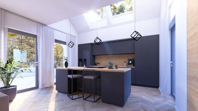 Im Erdgeschoss dieses Einfamilienhauses empfängt Sie ein großzügiges und offenes Wohnzimmer, das nahtlos ins Esszimmer und anschließend in die Küche übergeht. Diese lichtdurchflutete Raumgestaltung schafft eine einladende Atmosphäre, ideal für gesellige Abende mit Familie und Freunden. Von hier aus hat man zudem Zugang zur Terrasse. Ein besonderes Highlight des Hauses ist das große Carport, das nicht nur ausreichend Platz für Fahrzeuge bietet, sondern auch zusätzlichen Stauraum schafft. Im Dachgeschoss befinden sich zwei helle Kinderzimmer. Ein gemeinsames Badezimmer sorgt für zusätzlichen Komfort für die kleinen Bewohner. Das große Schlafzimmer für die Eltern ist ein Rückzugsort der Extraklasse, denn es verfügt über ein integriertes Badezimmer und eine angrenzende Ankleide. Unser Design 13.2 vereint durchdachte Raumkonzepte mit modernen Designelementen und schafft so ein Zuhause, das sowohl stilvoll als auch praktisch ist.