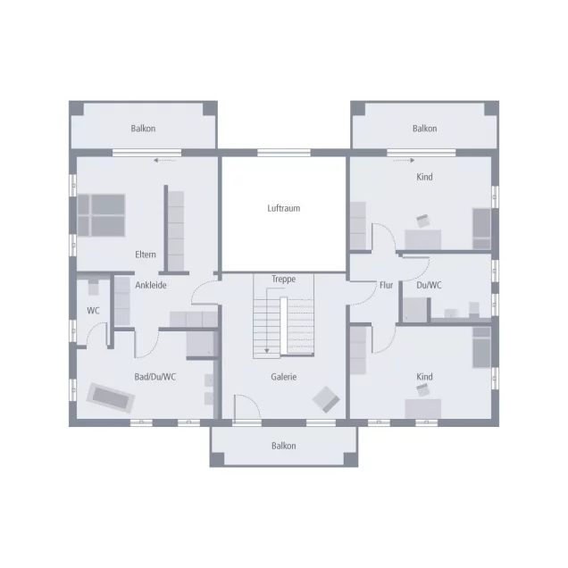 Herrschaftliches Wohnambiente auf einer Fläche von rund 300 m² - das ist unsere Stadtvilla Alabama. Angelehnt an die typische Südstaaten-Architektur vereint dieses Einfamilienhaus klassische und moderne Elemente auf eindrucksvolle Weise: Parterre befindet sich der große Wohn-Ess-Bereich mit sich angrenzendem Wohnzimmer. Drei große Türen ermöglichen einen direkten Zugang zum Garten und sorgen zudem für maximalen Lichteinfall. Besonders praktisch: Direkt neben der Küche befindet sich ein kleiner Abstellraum. Außerdem im Erdgeschoss: Gästezimmer und Gäste-WC sowie ein geräumiger Hauswirtschaftsraum. Über die zentral im Dielenbereich gelegene Treppe führt der Weg ins Obergeschoss, das in Eltern- und Kinderbereich unterteilt ist. Das Reich der Eltern besteht aus einem großen Schlafzimmer mit Ankleideraum und sich direkt anschließendem Bad mit abgetrenntem Toilettenbereich. Gegenüber: der Rückzugsort für die Kinder. Zwei Zimmer sowie ein von beiden Seiten zugängliches Bad stehen hier zur Verfügung. Zudem garantieren drei Balkone Sonnengenuss zu jeder Tageszeit.