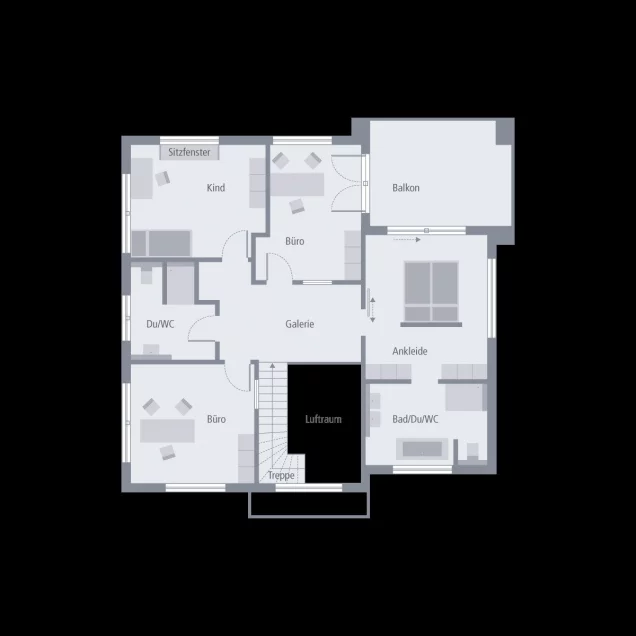 Zweigeschossige Stadtvilla unter Satteldach. EG 128,51 m², OG 116,74 m². Großzügiger Wohn-Ess-Koch-Bereich mit kurzen Wegen und Übersicht. Breite Fenster öffnen den Raum, Licht bringt Klarheit. Schiebetüren führen direkt in den Garten - Weite auf Knopfdruck. Büro im EG, Hauswirtschaft zentral, Gäste-WC. Oben: Elternbereich, zwei Bäder, drei weitere Zimmer für Kinder, Hobby oder Homeoffice. 2,80 m Raumhöhe sorgt für Ordnung und Ruhe.