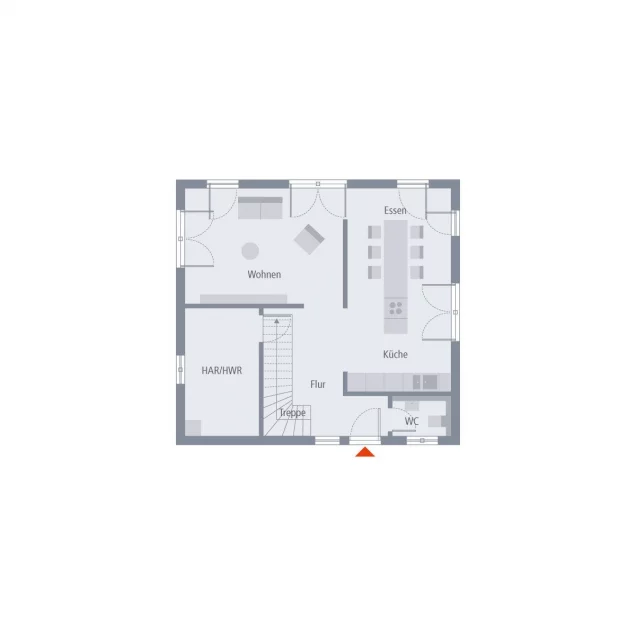 Hauswirtschaftsraum und Gäste-WC liegen seitlich davon.